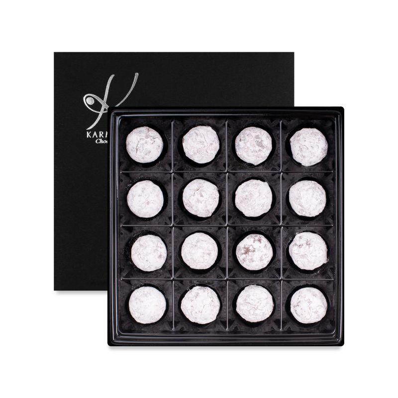 The harmonious duo of a firm egg liqueur and excellent dark chocolate highlighted by the sweetness of icing sugar.
