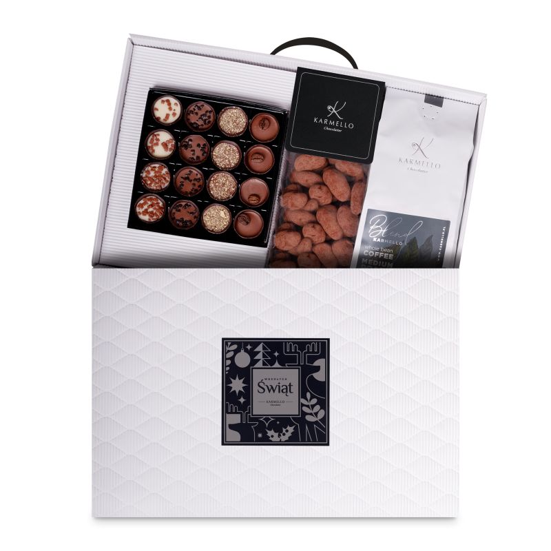A combination of a set of exclusive coffee chocolates, cocoa beans and Karmello coffee beans enclosed in a practical and elegant Neseser package. A perfect proposition for a Christmas gift. The set also includes a label with the inscription "Merry Christmas", thanks to which the composition acquires a unique character as a Christmas gift.