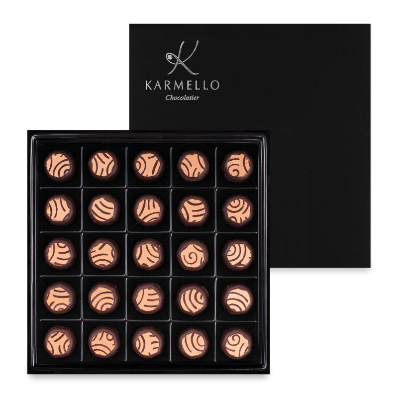 The unique flavour of olive oil and cardamom balanced by the sweet taste of milk chocolate and enrobed in dark chocolate.