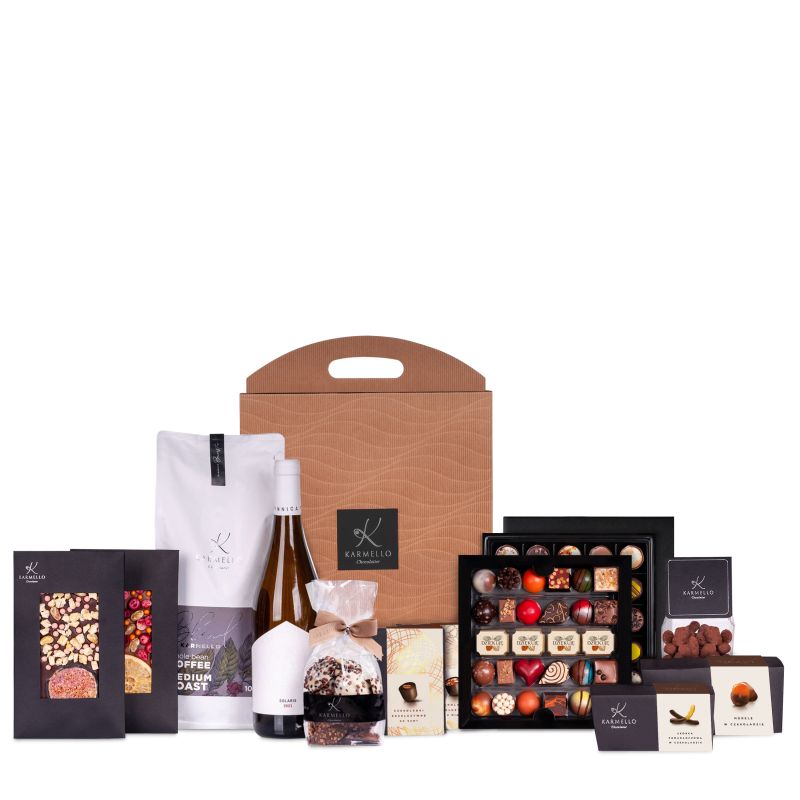 New from Karmello! The new shape of the elegant packaging contains a variety of Karmello products. Chocolate sets made of Belgian chocolate, chocolate-covered fruit and chocolate with various additions will delight the eyes and palate of every chocolate lover. In addition to delicious chocolates made from Belgian chocolate, you will also find dry Solaris Wine. The perfect set as a gift for a special person.