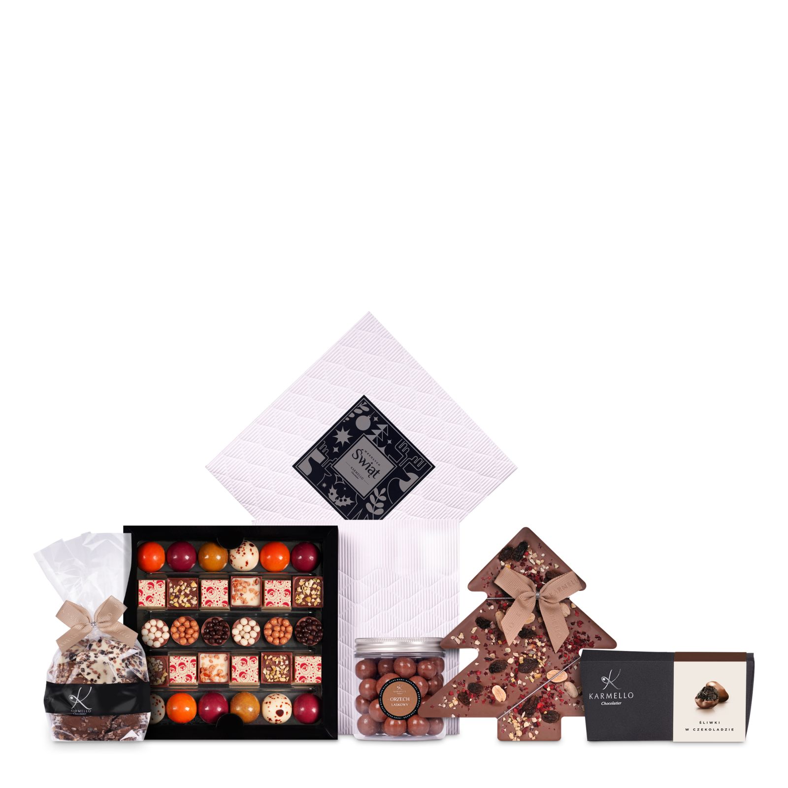 The elegant white packaging contains products that will appeal to every recipient. There's something for everyone, from filled chocolates, chocolate-covered fruit to student cookies. A perfect proposition for a Christmas gift.