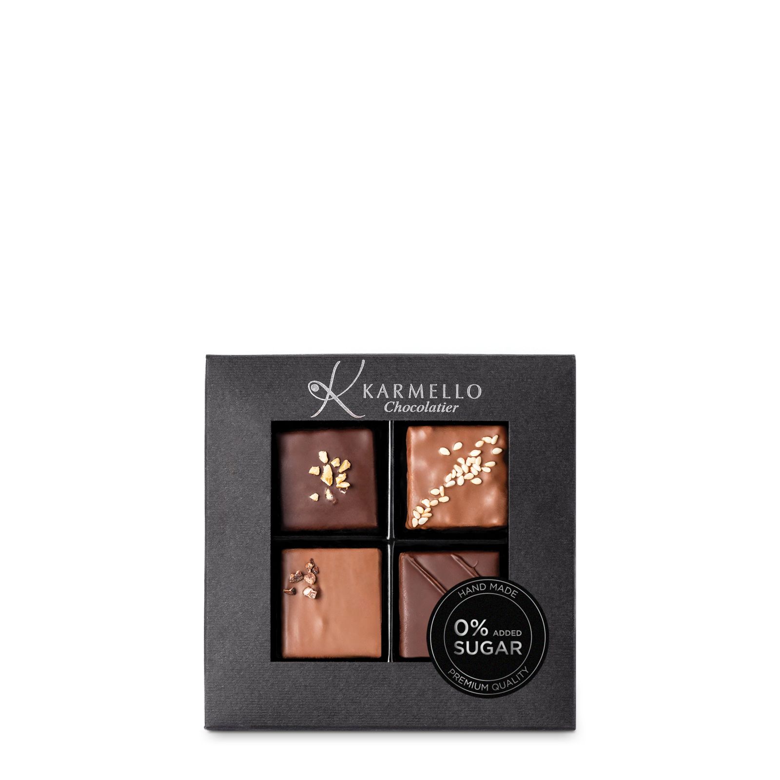 COLLECTION OF 4 PRALINES WITH NO ADDED SUGARS ASSORTED PRALINES WITH FILLING (65 %) contains sweetener Ingredients: sweetener: maltitol; cocoa mass; cocoa butter; ALMOND paste; CREAM; PEANUT paste; SESAME paste; stabilizer: sorbitols; BUTTER; whole MILK powder; roasted, crushed cocoa beans; freeze-dried apples; emulsifier: SOYA lecithin; natural vanilla flavour; roasted SESAME SEEDS; PISTACHIO pieces; powdered ginger; salt; natural coconut flavour. Milk chocolate with no added sugars: cocoa solids: 33.9 % minimum. Dark chocolate with no added sugars: cocoa solids: 53.9 % minimum. *CONTAINS NATURALLY OCCURRING SUGARS The product may contain: GLUTEN; NUTS, NAMELY: HAZELNUTS, WALNUTS, CASHEW NUTS, PECAN NUTS; EGGS AND PRODUCTS THEREOF. Nutritional value / 100 g of the product Energy 1980 kJ / 479 kcal Fat, of which saturates 38.0 g 20.0 g Carbohydrate, of which sugars 33.0 g 3.4 g Protein 7.3 g Salt 0.23 g