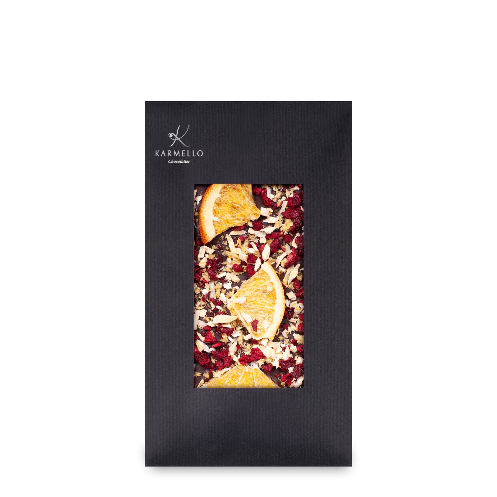 A panel of delicious dark Belgian chocolate sprinkled with cherry and orange pieces. The perfect combination for lovers of original flavors.