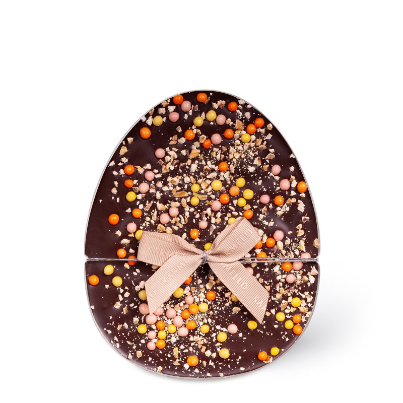 Handcrafted from fine dark chocolate with a silky texture and a deep cocoa aroma, it delights from the very first glance. The whole piece is beautifully finished with crunchy chocolate pearls that enhance the depth of flavor and add an elegant touch. In its striking presentation, it becomes a unique decoration for an Easter arrangement and a beautiful Easter gift.