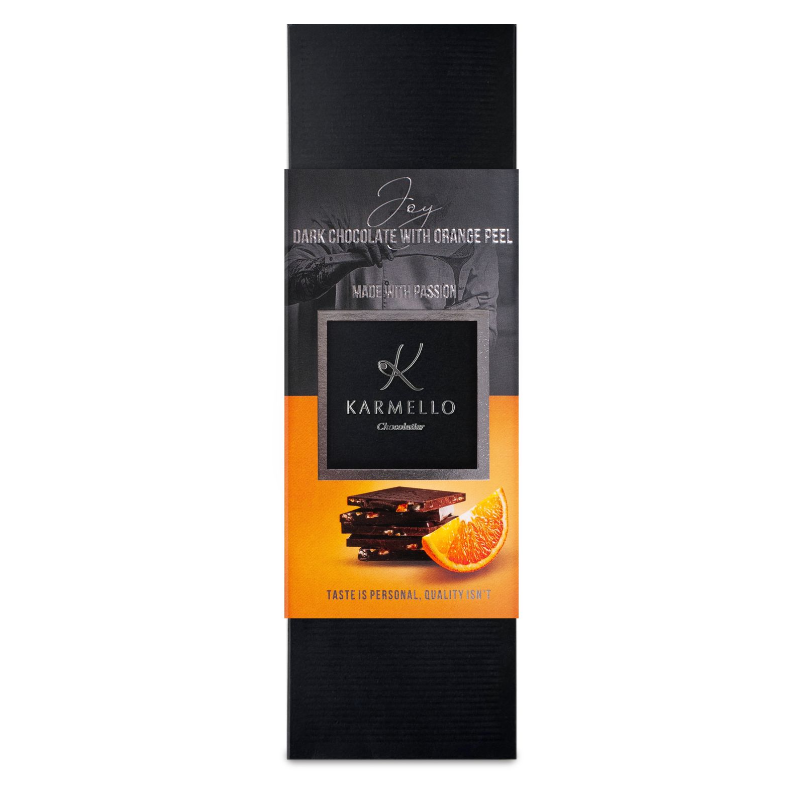 The strong taste of dark chocolate combined with the fruity taste of orange peel. The Joy line is the quintessence of chocolate pleasure. The most perfect, carefully selected accessories harmoniously blend with delicate Belgian chocolate is a recipe for complete happiness in every piece.