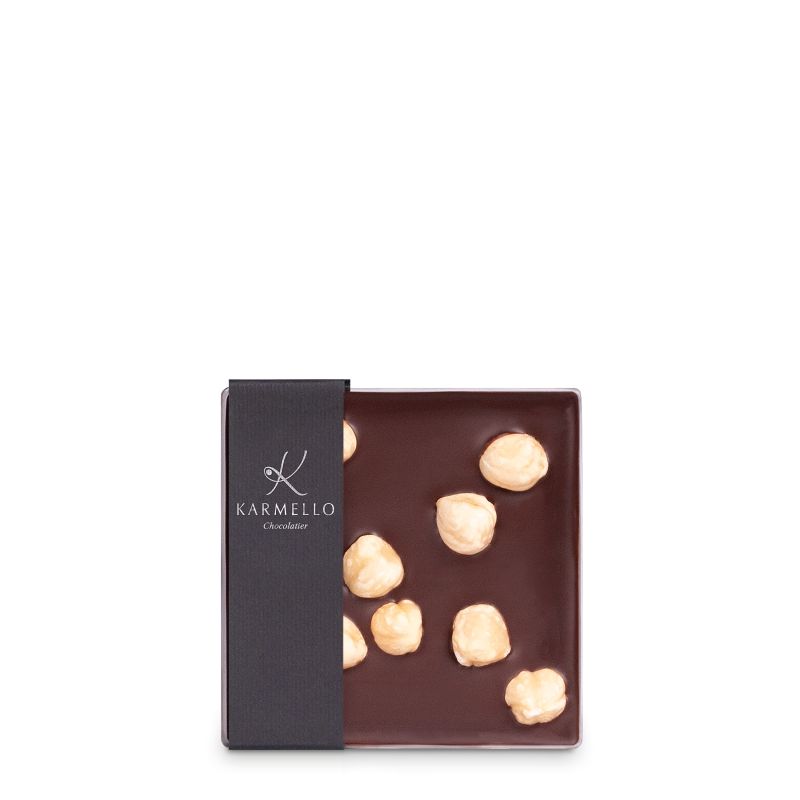 DARK CHOCOLATE WITH HAZELNUTS A bar of top-quality chocolate with aromatic tasty additions guarantees a moment of sweet pleasure at any time of the day. For the followers of this theory we have prepared a range of chocolate bars, whose fine taste is complemented by selected additions: from classic dried fruit and nuts to candied fruits.