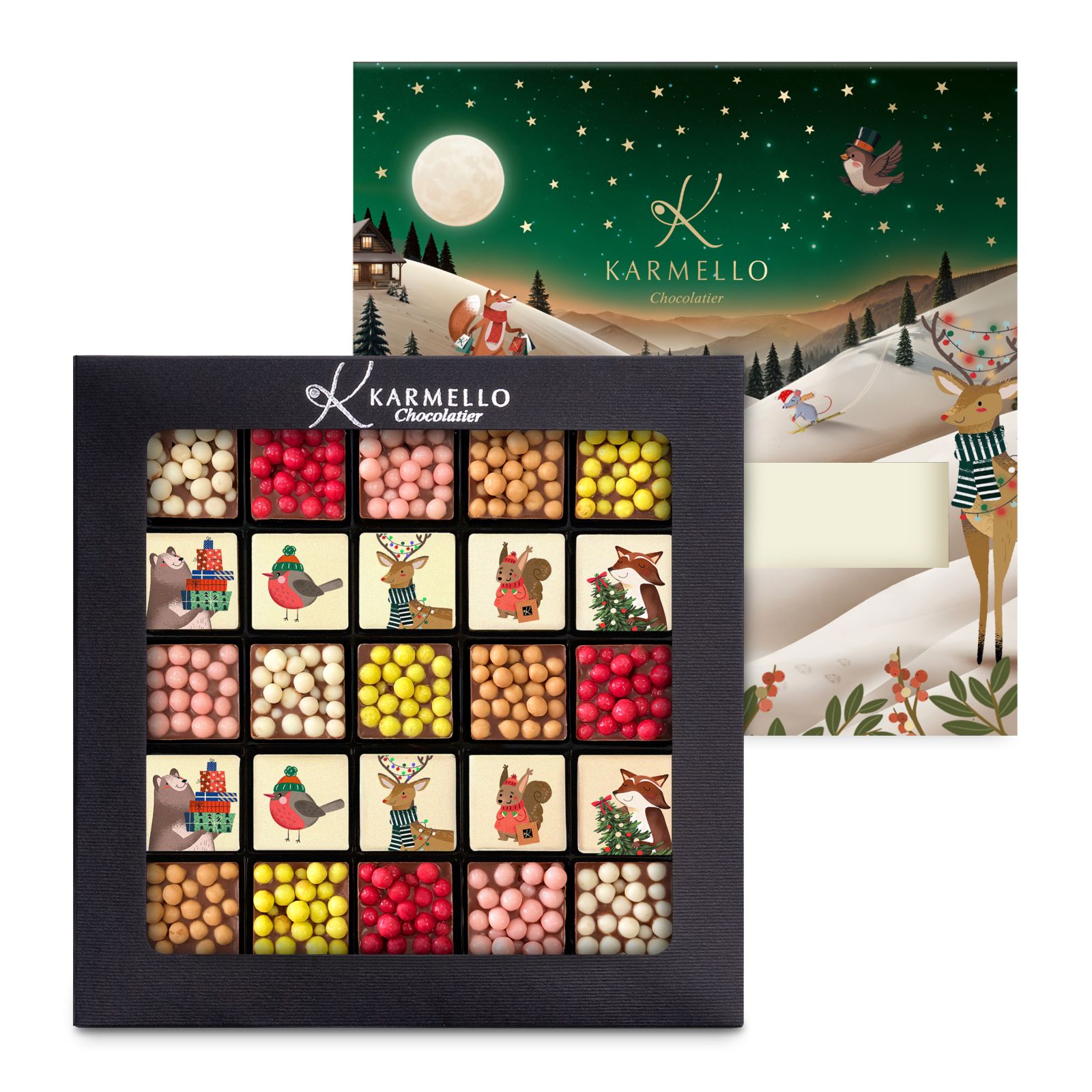 The Forest Tales collection is a chocolate journey through the festive forest – full of warmth, aromas, and the magic of winter. Inside the box, you'll find a blend of unique flavors: peanut, raspberry, strawberry, vanilla, peanut, and dandelion – combinations that envelop the senses like a soft blanket on a December evening.