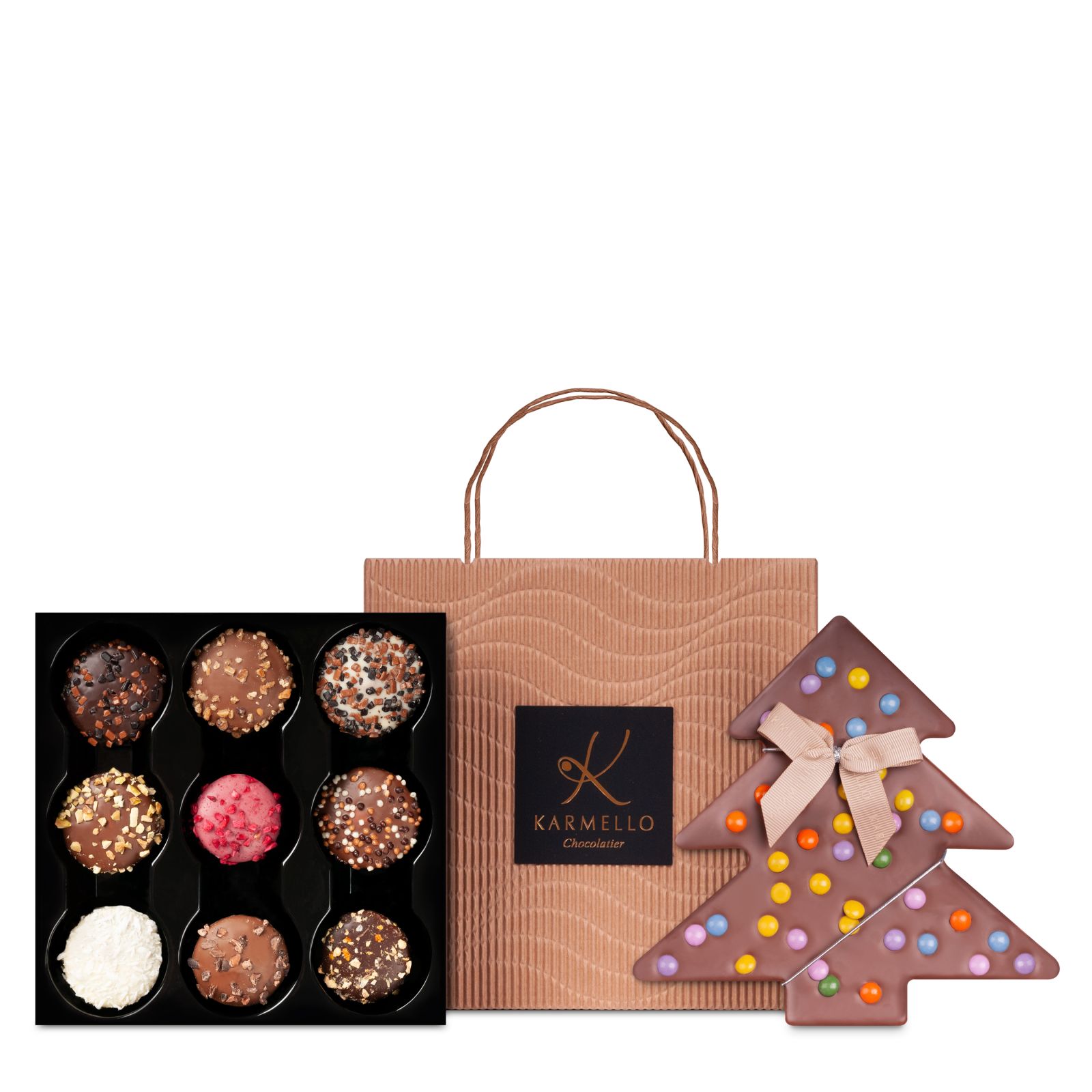 A sheet of Belgian chocolate in the shape of a Christmas tree and a Christmas set of chocolates - a combination that will delight everyone. The products are packed in an elegant, beige bag. The whole is a perfect Christmas gift.