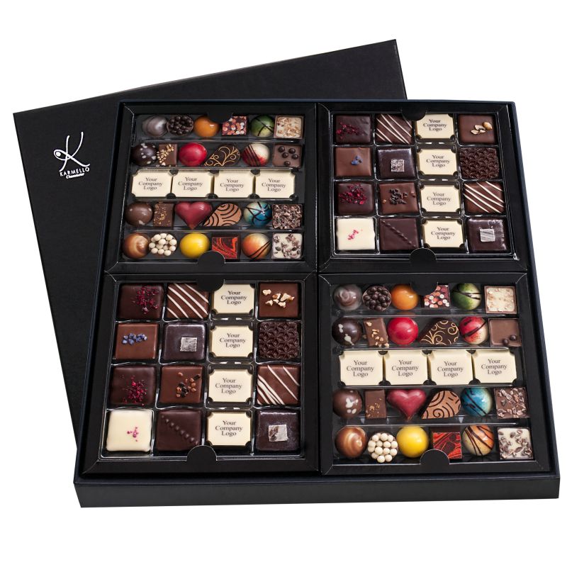 KAR055 FOUR-TRAY SET OF PRALINES WITH COMPANY LOGO AND KARMELLO STANDARD WITH COMPANY LOGO