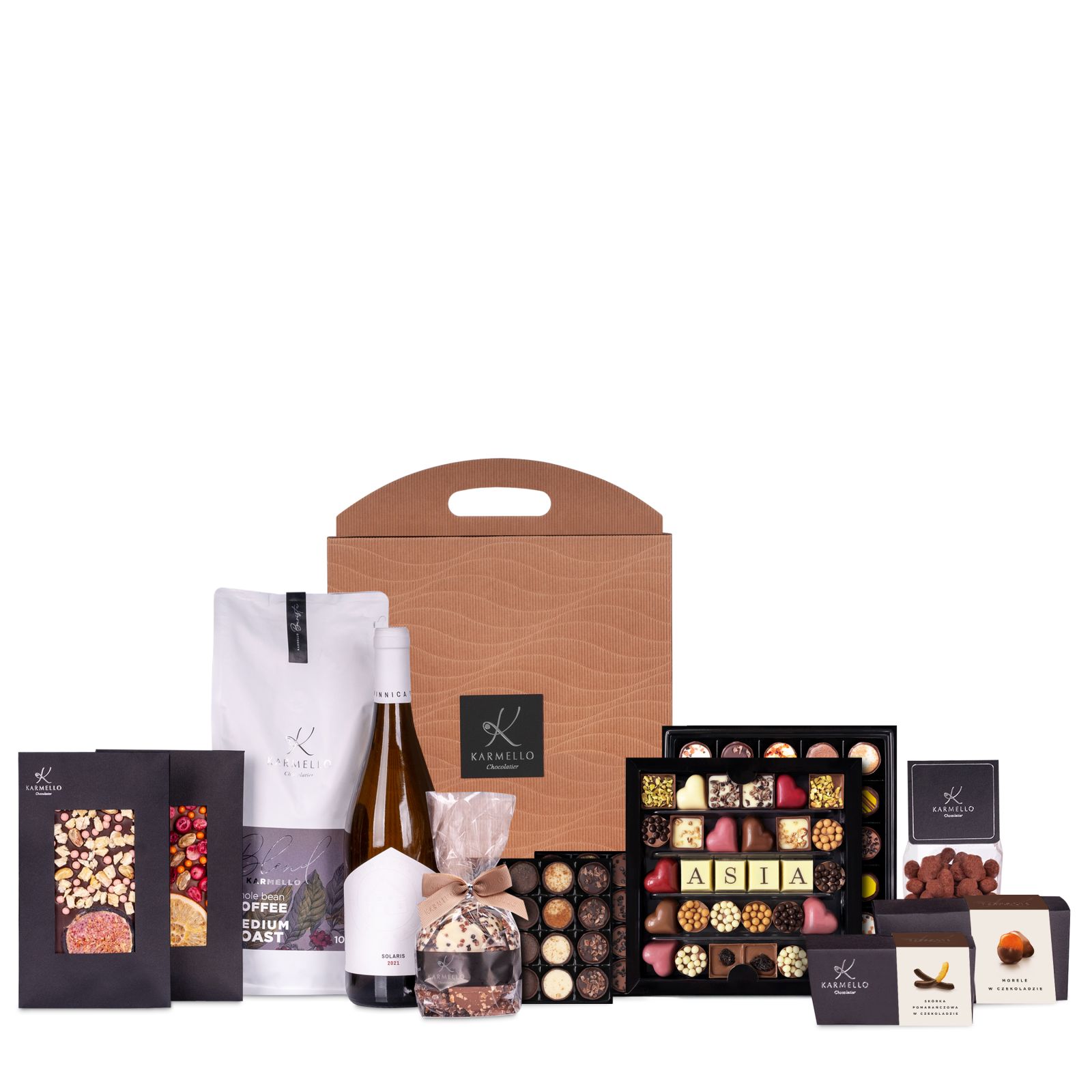 Chocolate sets made from Belgian chocolate, fruits covered in chocolate, and chocolates with a variety of toppings will delight both the eyes and the palate of every chocolate lover. In addition to the exquisite chocolates made from Belgian chocolate, you'll also find the fine Solaris wine. This set is perfect as a gift for a loved one.