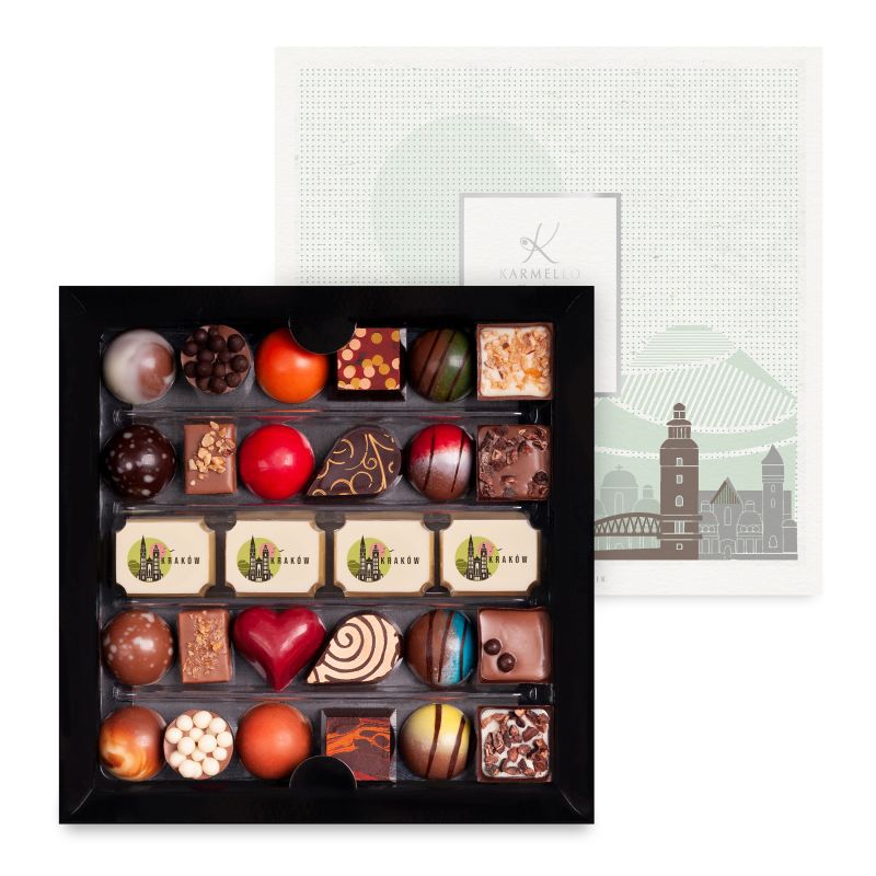 Karmello Standard is an invitation to the magical world of Karmello Chocolatier. A chocolate set specially and carefully composed to let you explore the best flavours of our products, starting with subtle, nutty notes, and ending with distinct alcohol aromas. The product is both attractive visually and delicious in taste. The set also includes the "KRAKÓW" band.