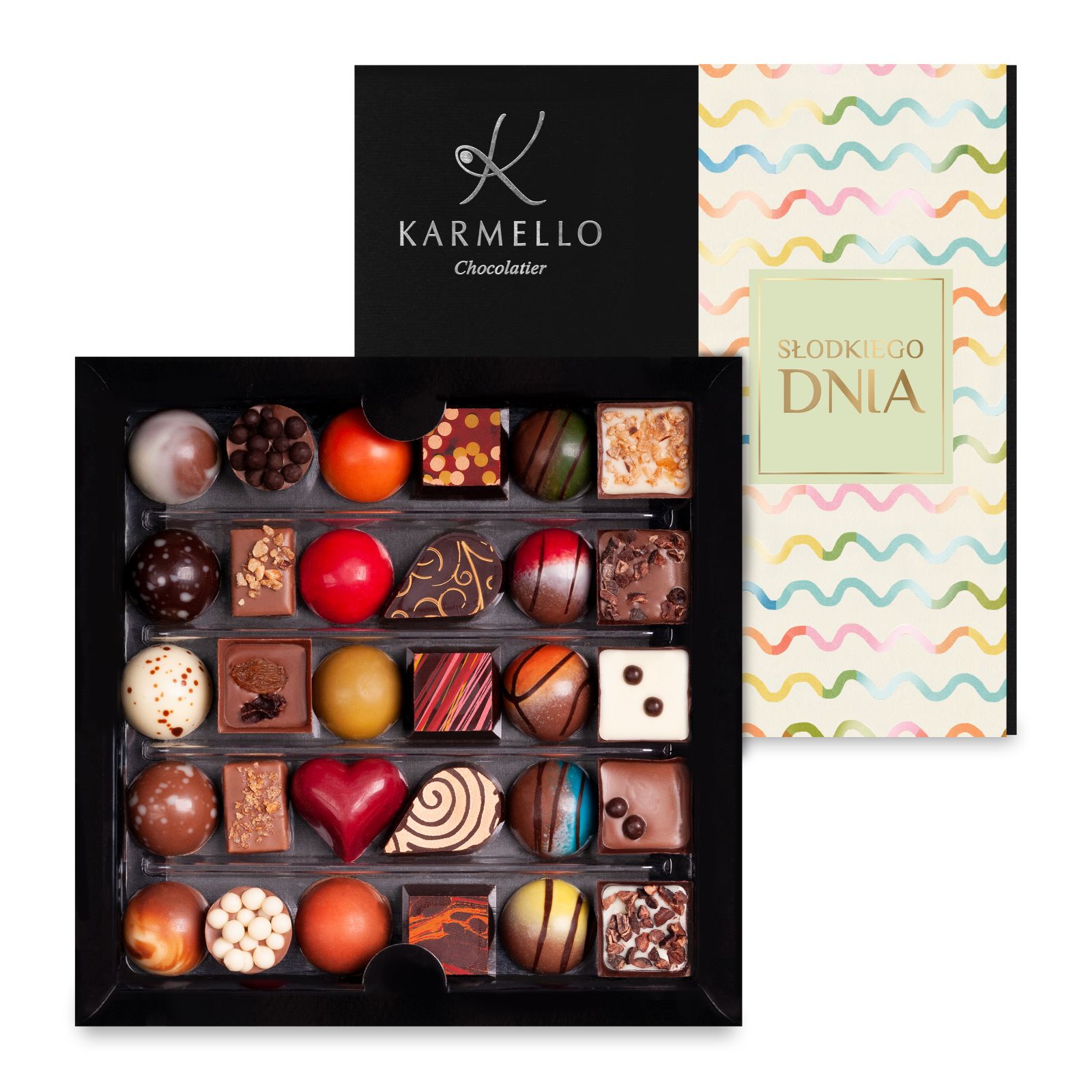 Karmello Standard is an invitation to the magical world of Karmello Chocolatier. A chocolate set specially and carefully composed to let you explore the best flavours of our products, starting with subtle, nutty notes, and ending with distinct alcohol aromas. The product is both attractive visually and delicious in taste. The packaging additionally contains a band with the inscription "ALL THE BEST".
