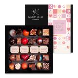 Karmello standard is an invitation to the magical world of Karmello Chocolatier. A set of chocolates composed in such a way that you can get to know the most outstanding flavors of our products, starting with subtle, nutty notes, ending with strong alcohol aromas. The product is attractive both visually and in terms of taste. The set also includes chocolates with the occasional print "I love you, Mom" and a headband.