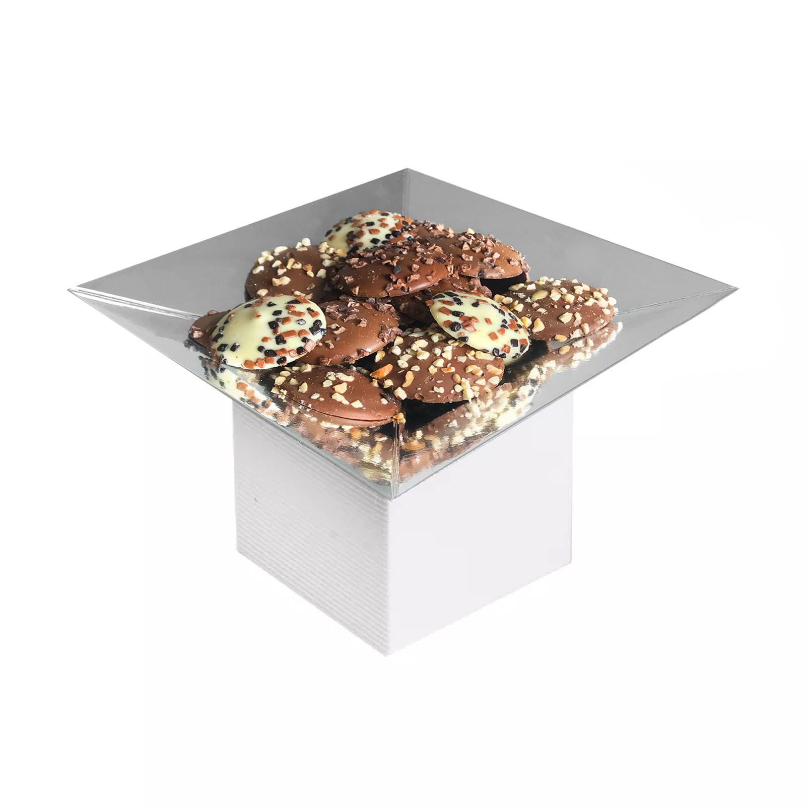 The assorted STANDARD ‘FOR HER’ SELECTION features strawberry flavour combined with ruby chocolate, gingerbread, gianduja and Malibu. COOKIES sport delicious gingerbread enrobed in sweet, white chocolate. Also part of the set are ROSE and COCONUT PRALINES. The set also includes chocolate-covered HAZELNUTS and RAISINS that are a perfect choice for a small snack. The L set features our best-selling treat - delicious macarons, which have proved a big hit with our customers. Macarons are extremely delicate and crispy cookies housing scrumptious chocolate or delicate mascarpone-based filling with numerous fancy flavours. They also pair perfectly with fine wine.