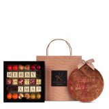 A charming, festive set in an elegant bag that will delight any chocolate lover. Inside, you'll find the inscription "Merry Xmas" composed of chocolates and a chocolate bauble made of the highest quality chocolate. This is a unique gift that will bring a touch of sweet joy to the holiday season.