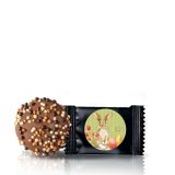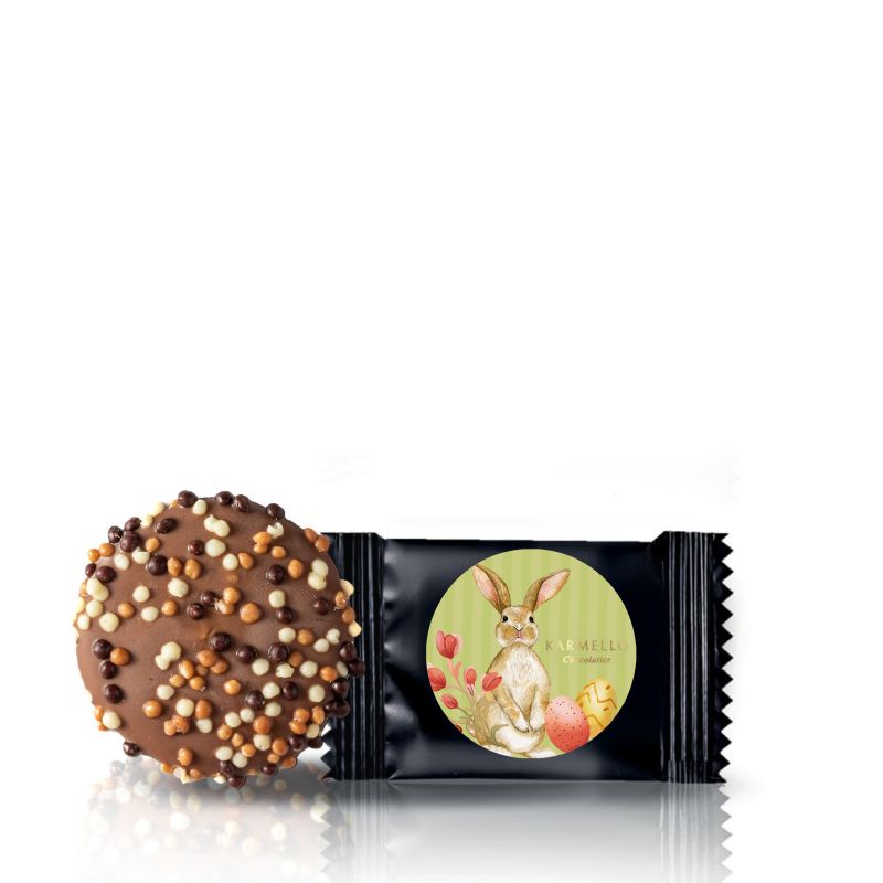 The milk cookie is a little Easter treat that tempts from the very first glance. Beneath a delicate chocolate layer, it hides a velvety filling made from white chocolate and creamy hazelnut paste. The whole thing is finished with a colorful festive sticker, making the cookie look charming and perfect as a small gift or a sweet surprise.