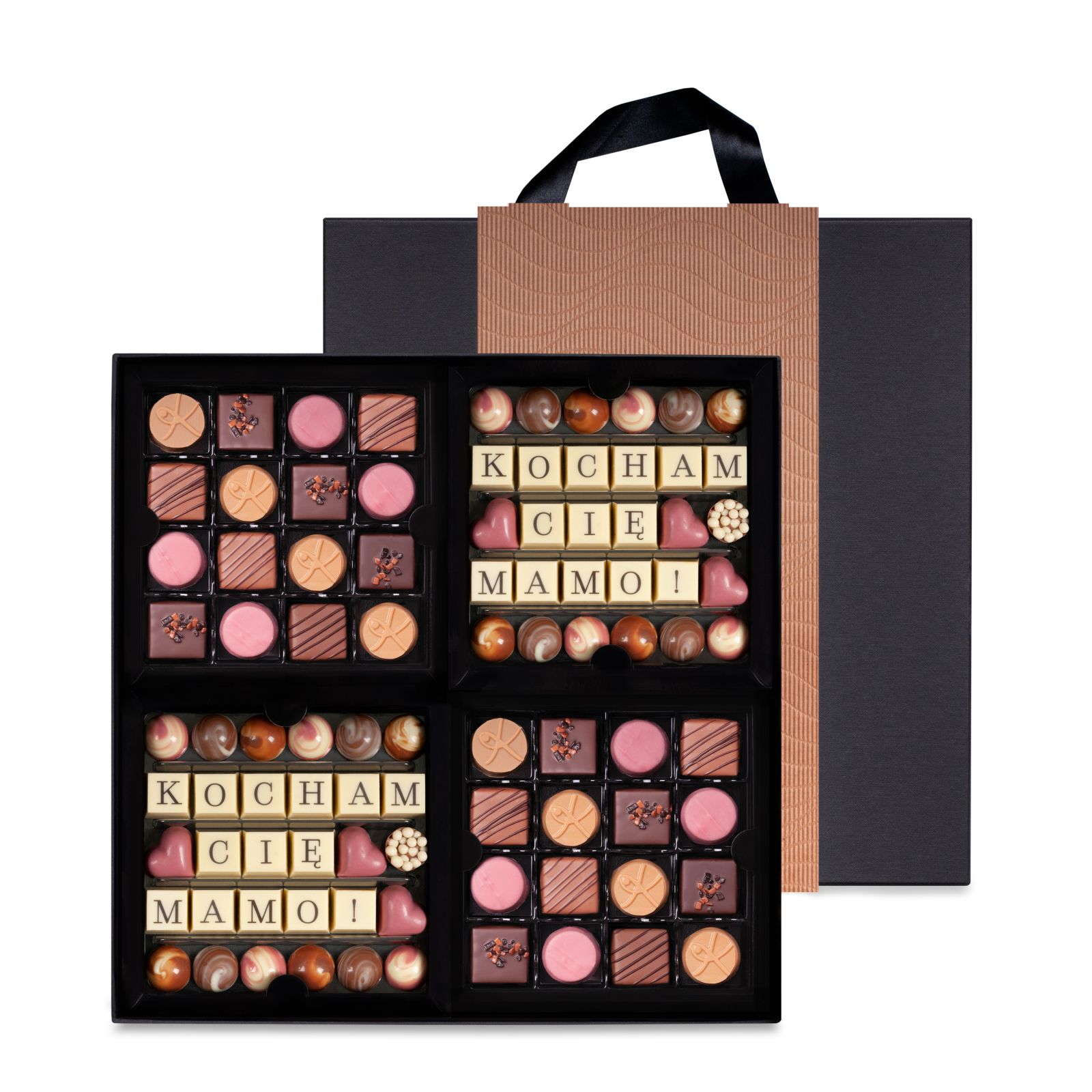 The Quadruple Chocolate Set for Mother's Day is an elegant gift consisting of four trays of exquisite chocolates with the inscription "I love you, Mom" and delicious pralines. It is the perfect way to express love and gratitude to your beloved mother.