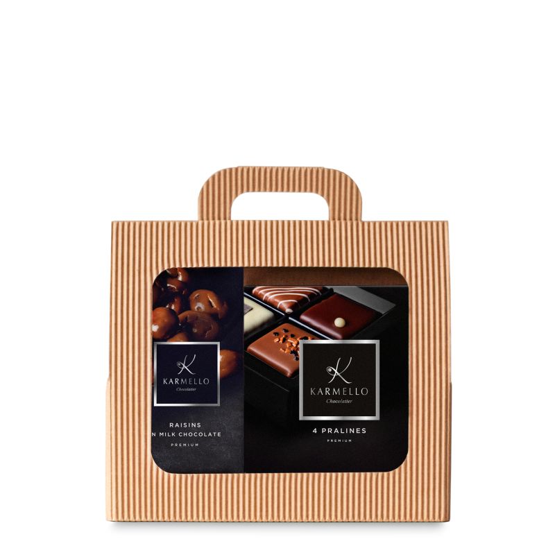 A perfect duo for lovers of classics at their finest. The set includes four pralines in a variety of flavors and chocolate-covered raisins – a combination that delights with its simplicity and harmony. An elegant, sweet gift that will delight anytime.