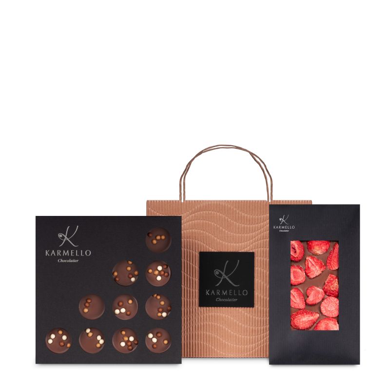 A perfect proposition for a sweet gift for every gourmand: caramel fruzzles and a sheet of Belgian milk chocolate decorated with extras. All packed in an elegant bag.