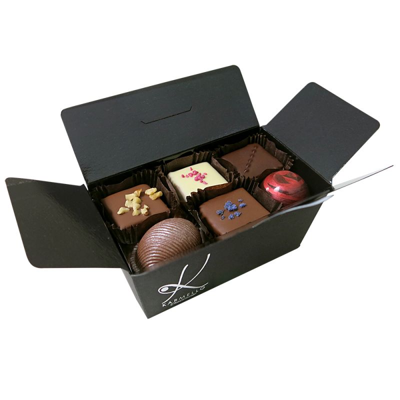 This selection will make anyone feel better. The products in this set have been carefully selected to let you enjoy top-quality chocolate in various forms, at affordable price. The photo shows a sample set.