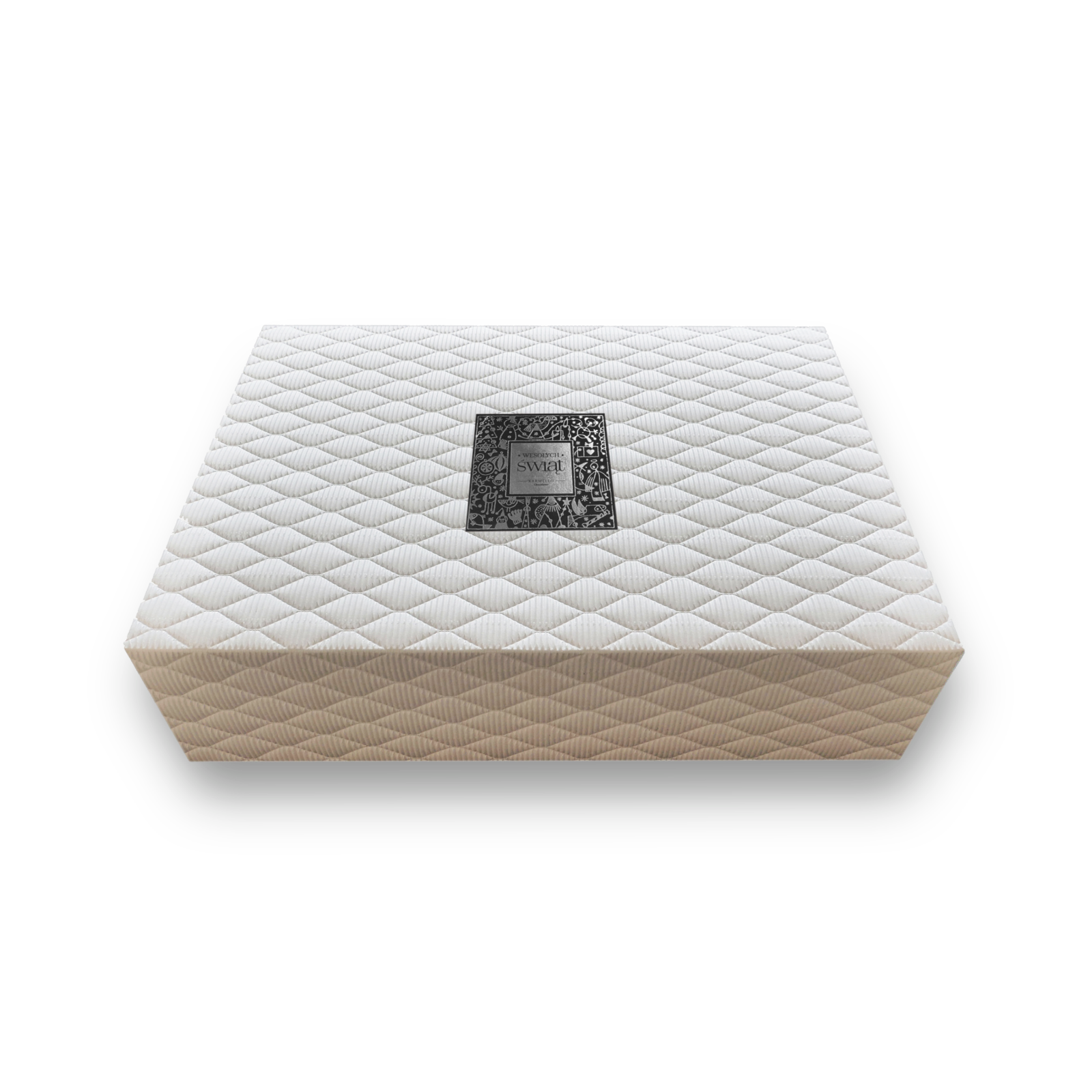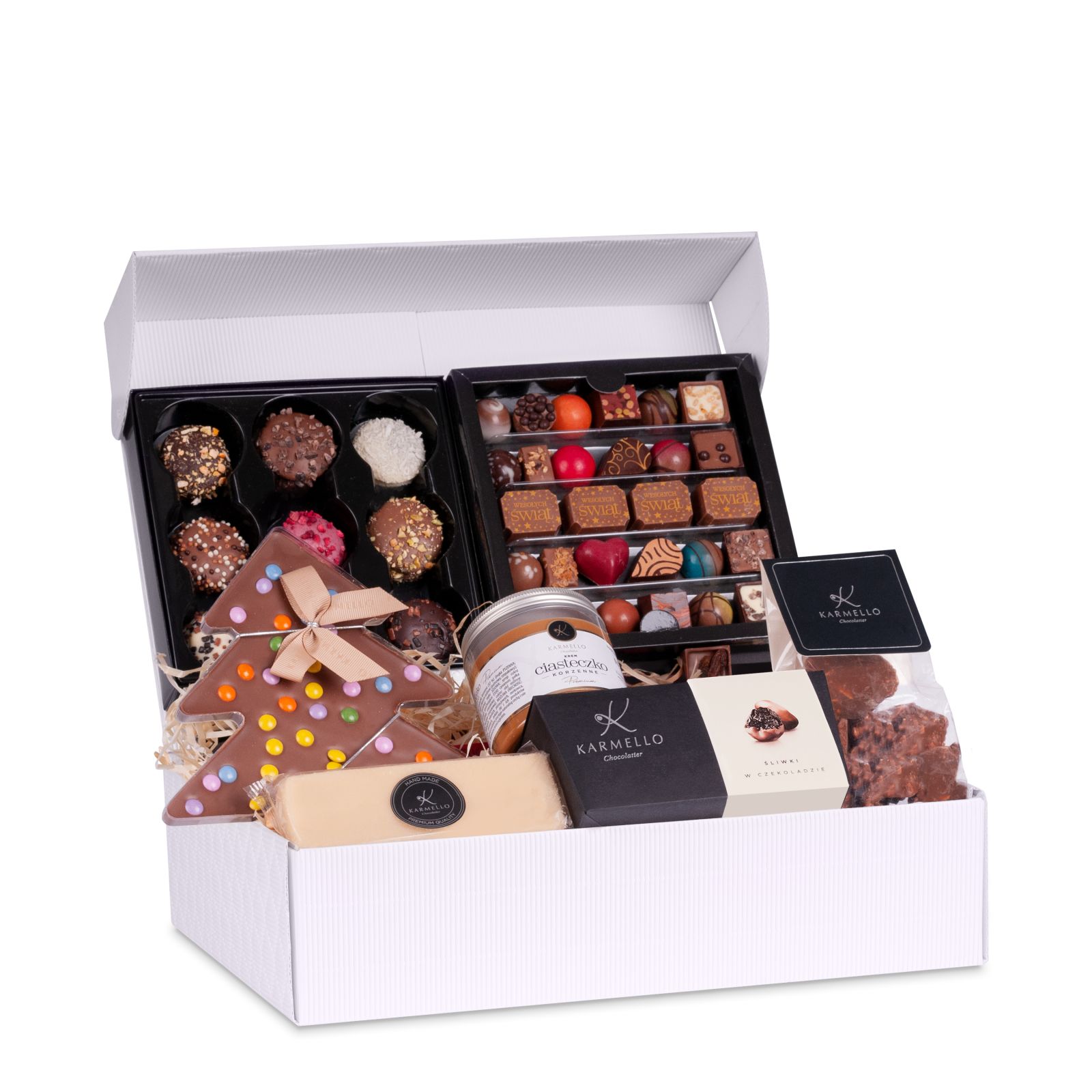 The white box packaging filled to the brim with sweets from Karmello is the perfect idea for a Christmas gift. There is something for everyone from a set of chocolates, marzipan to magical student cookies. The perfect set for a Christmas gift. The set also includes a label with the inscription "Merry Christmas", thanks to which the composition acquires a unique character as a Christmas gift.