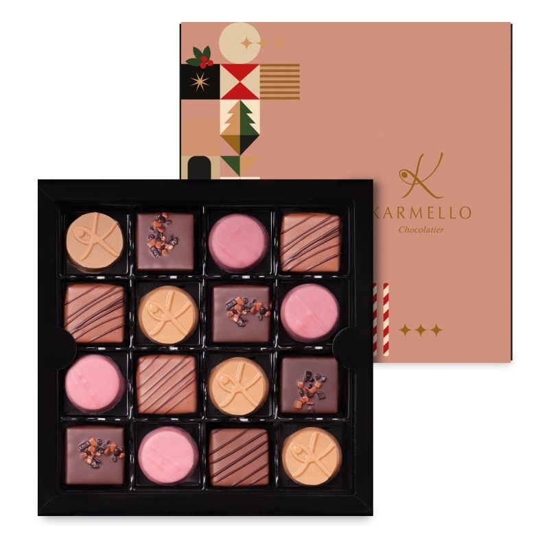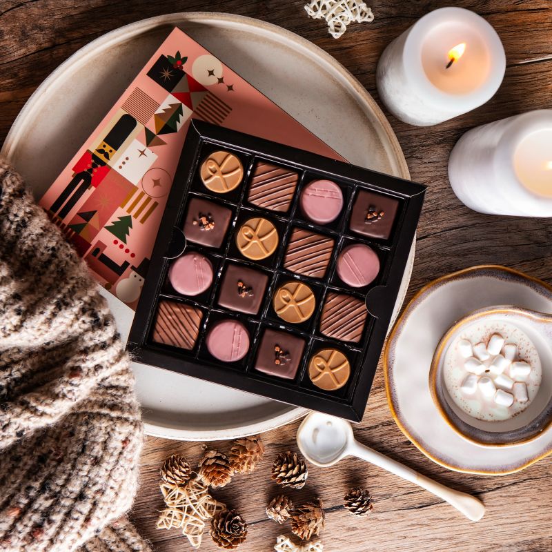 The Nutcracker Collection is an elegant composition inspired by classic Christmas tales. Inside, pralines with deep, harmonious flavors await—caramelized banana with cinnamon, coffee caramel, burnt butter, and ruby with peanut create a sensual, warm whole.