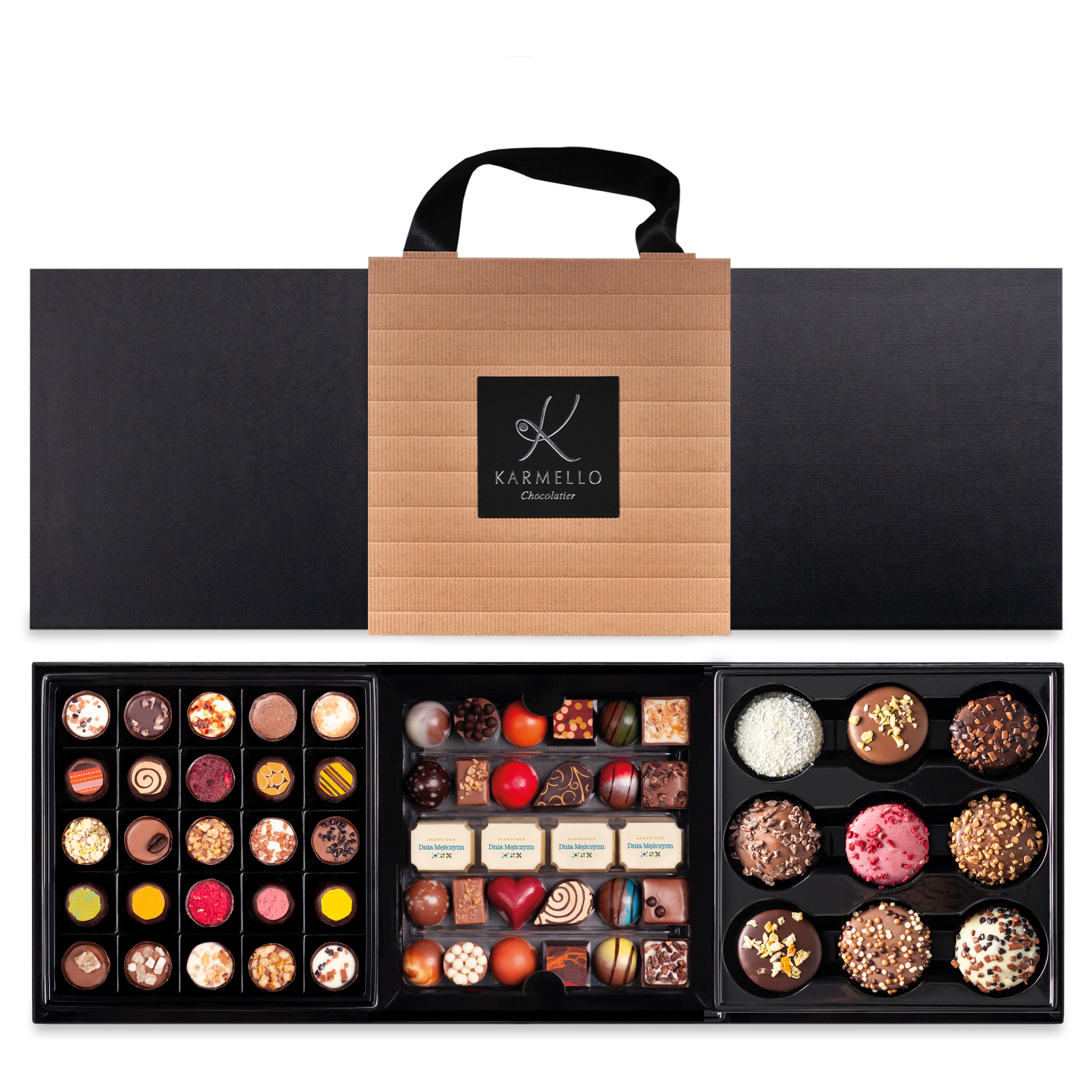New packaging from Karmello! A combination of three compositions of chocolates in one package. The perfect composition for a gift for every man on his holiday - the headband will make it easier to give a gift.
