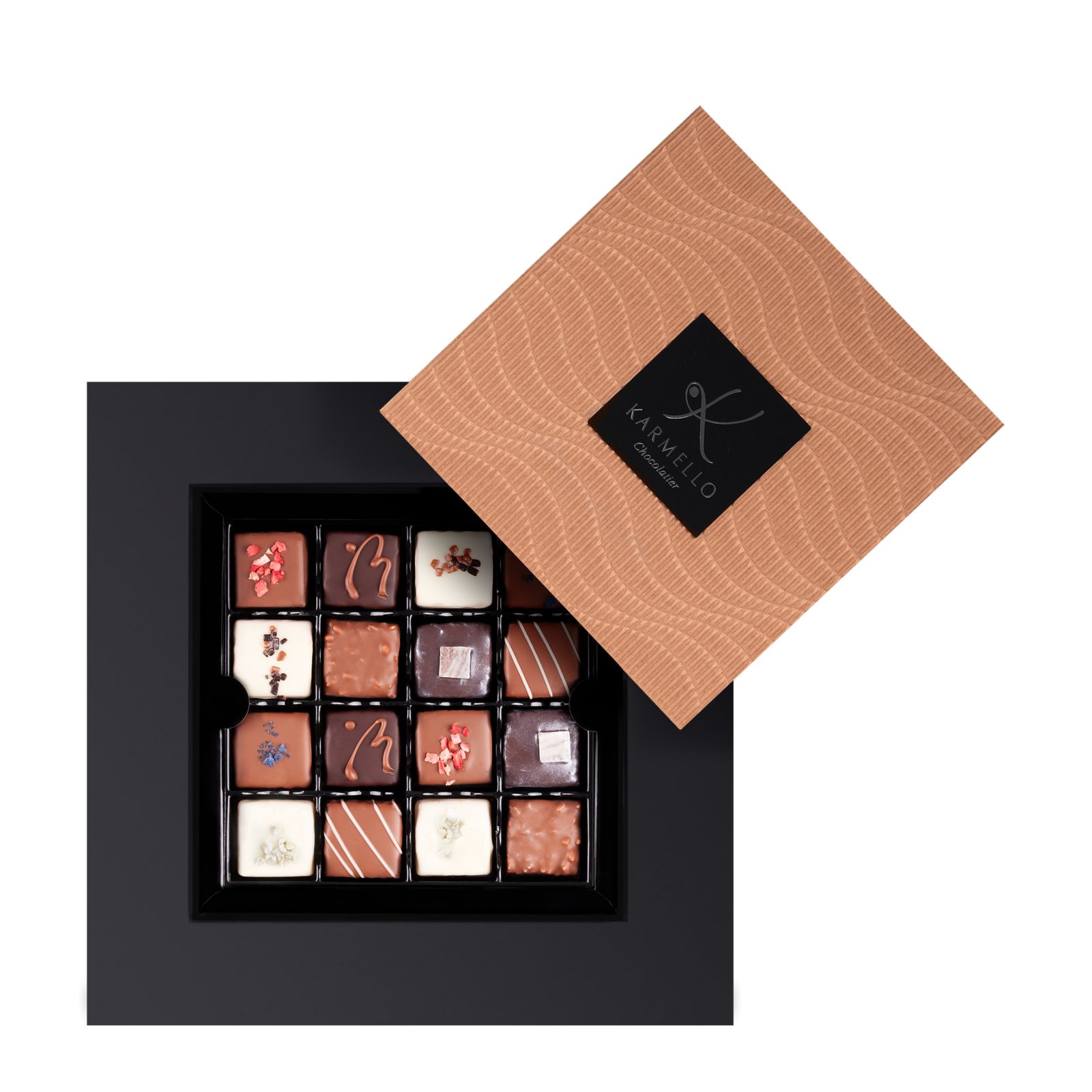 Z24/42 COLLECTION OF 16 PRRALINES WITH LOGO IN A BOX WITH A FRAME
